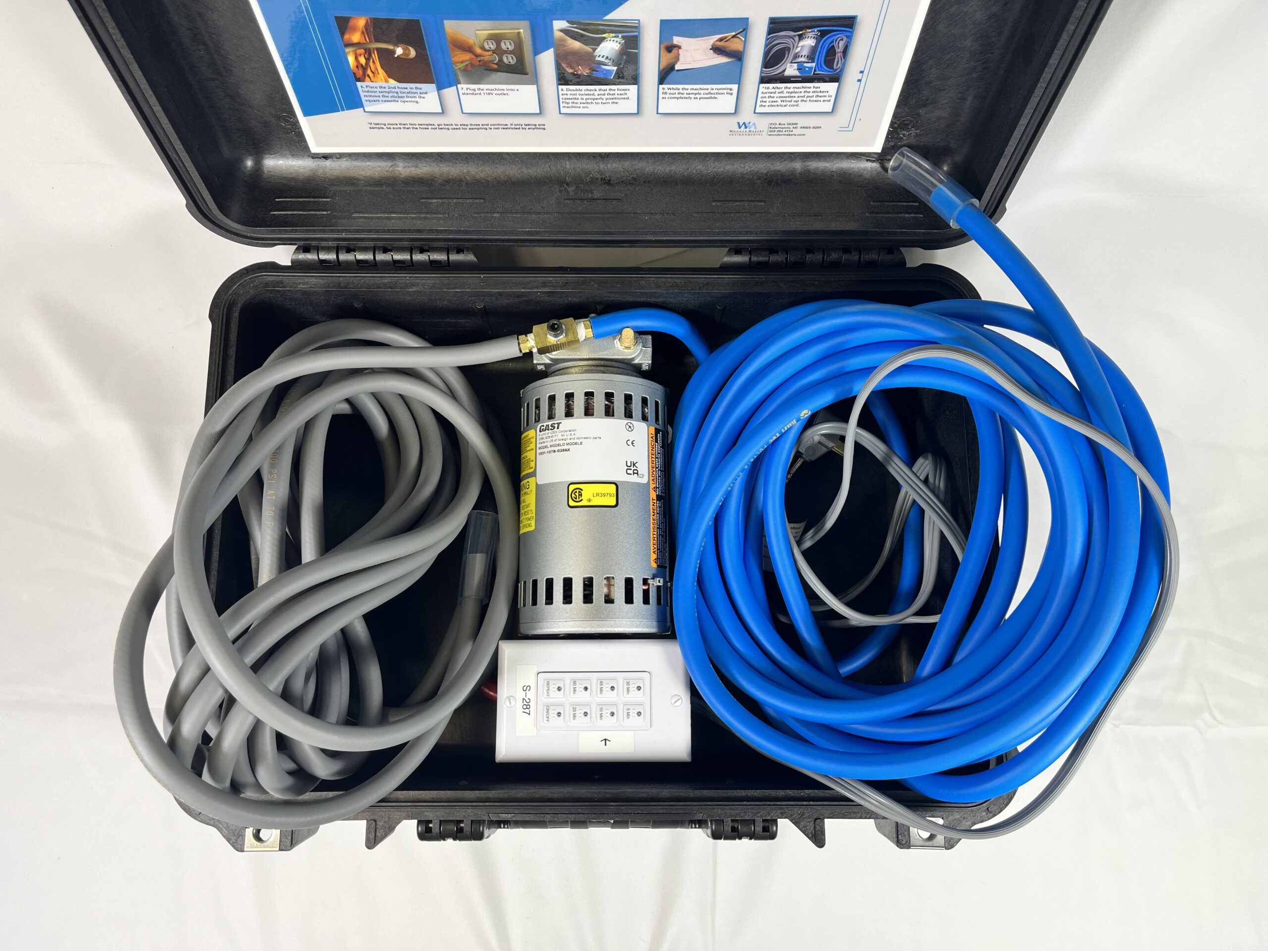High volume vacuum pump, two 25’lengths of plastic tubing, 110-volt cord, on/off switch, rugged carrying case